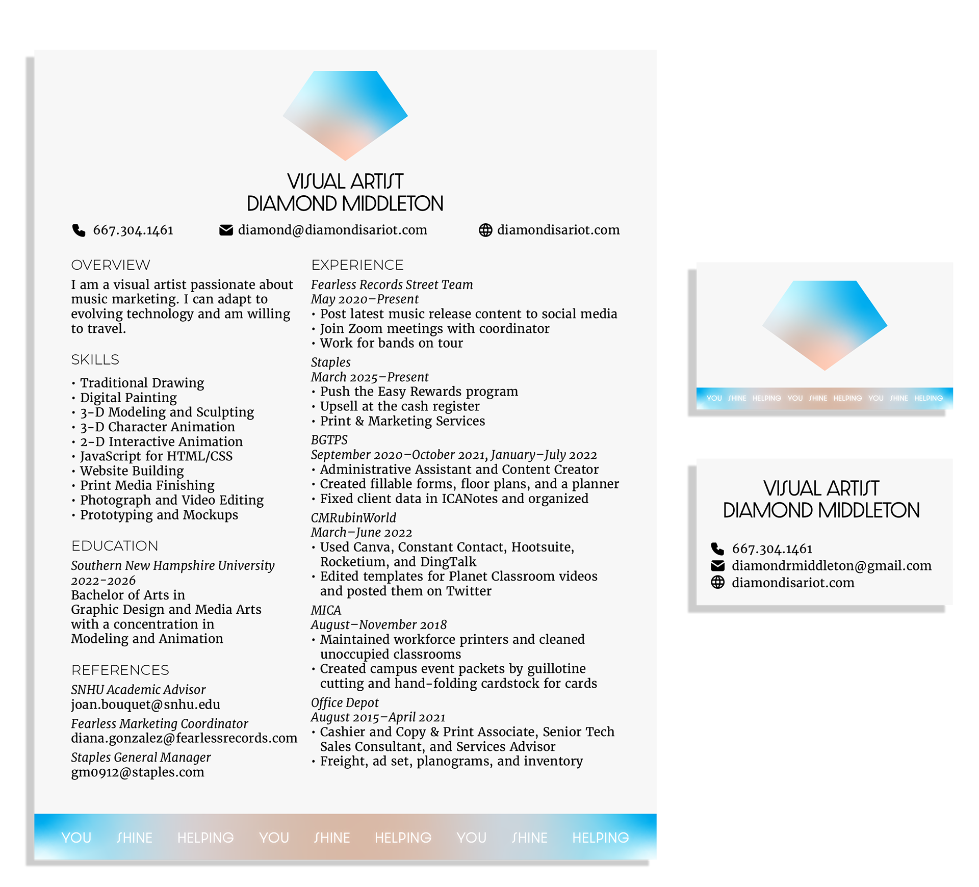 Self-Promo Stationery highlights consistency of the design elements and principles I try to use the most: color, proximity, and unity. These mockups have images of real items with drop shadows. On Adobe Stock, I found the letterhead with business card and envelope Photoshop templates by Petr. Next, I found a pinback button one by SdecoretMockup to mimic a giveaway piece. Lastly, I changed the levels, brightness, and image placement modes to make them seem more life-like. For the typsetting, the body copy is in Merriweather. Filled SVG icons of the phone, mail, and globe are from Tabler Icons. Then, I found Dazzle Unicase for my role, name, and tagline at the bottom of my letterhead, adding inner and outer glow layer styles.